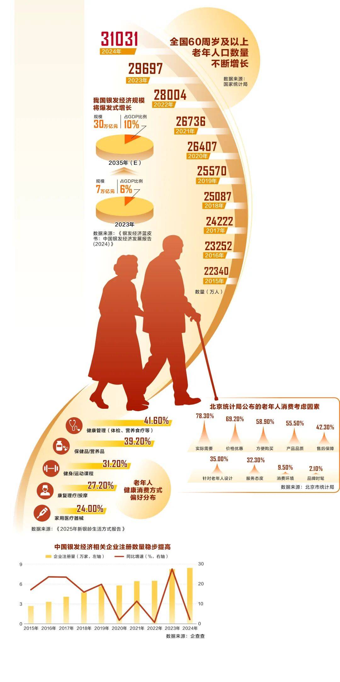规模将从当前的约3.1亿人添加到2030年的3.9亿人。从贸易模式的角度,复杂的生齿基数对应着失能白叟的快速添加,让老年人共享成长、安享幸福晚年。保健品/养分品、健身/活动课程紧随其后,银发经济相关企业的注册数量逐年增加,很少进行情感消费。感情消费成为银发经济的增量引擎。其素质是抓住人的需求变化,积极应对生齿老龄化。