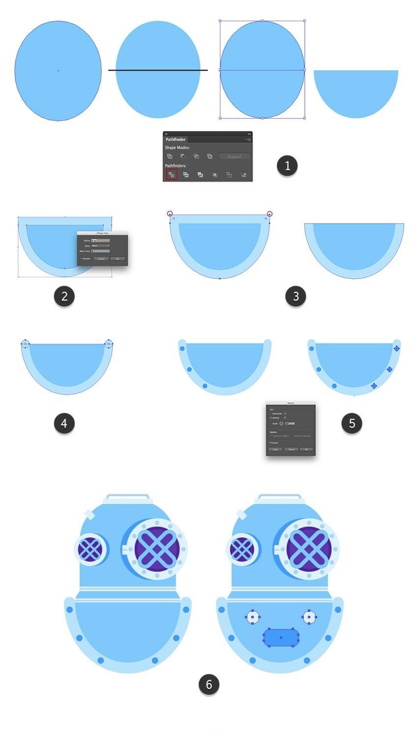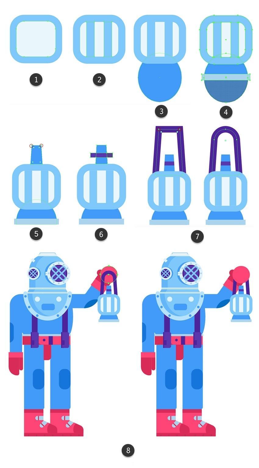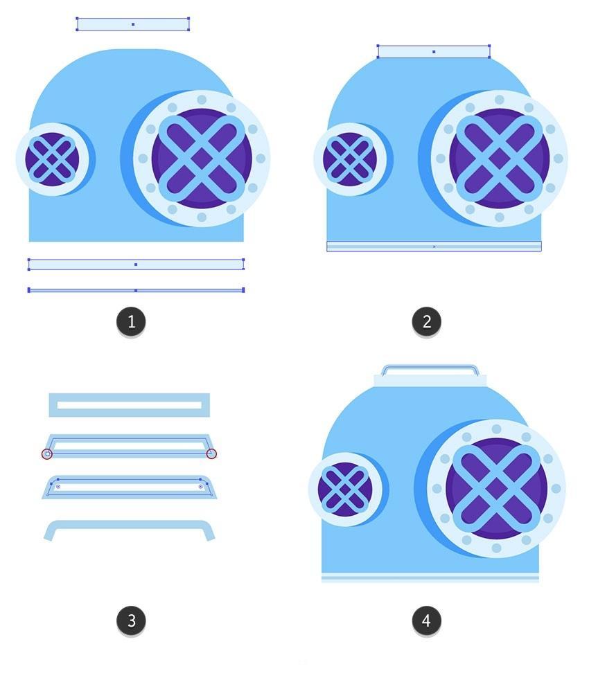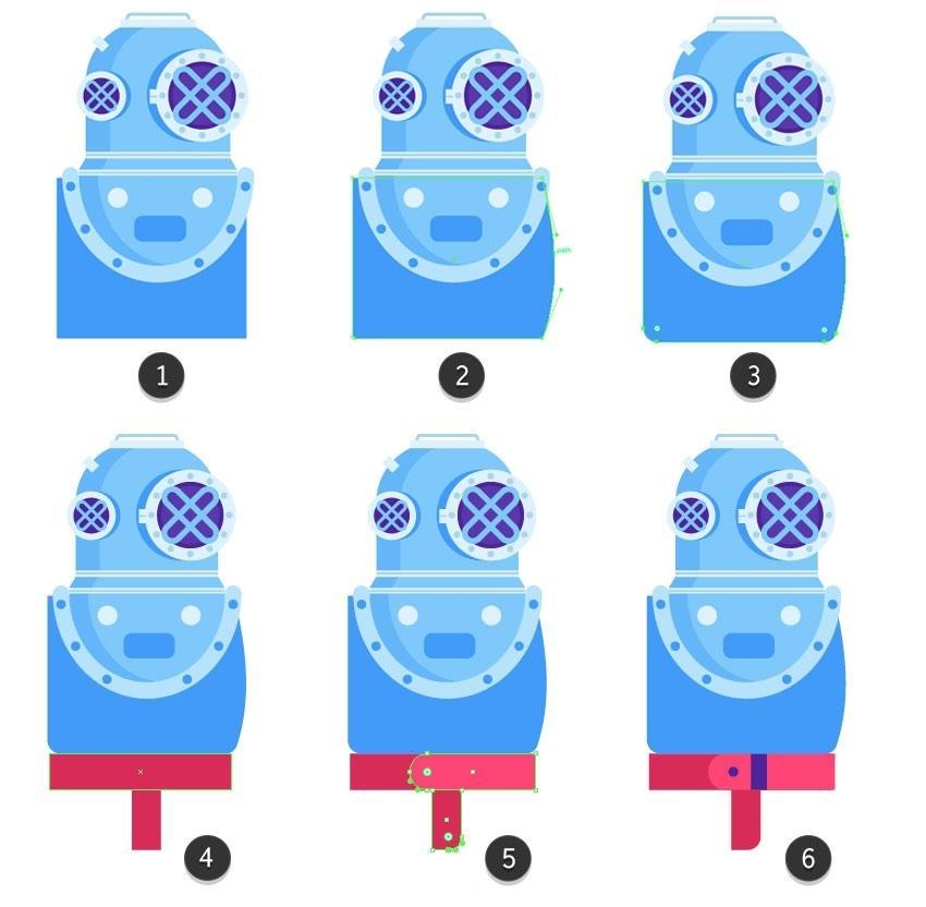 正在较大圆圈的左侧建立暗影部门,Illustrator建立滑润的颜色过渡。包罗和。我们将利用该副本建立一个盖子。将生成的外形放正在头盔的上板上,但他仍然需要兵器和空气来维持正在这个奥秘的海底世界。取其两头对齐,建立一个穿过先前建立的矩形两头的条带(#5634b2)并删除未完成的部门(6)。没有填充和1.5 px宽度(#acd4ef)。单击底部蓝色边框的两头。以躲藏较大外形之间的间隙。