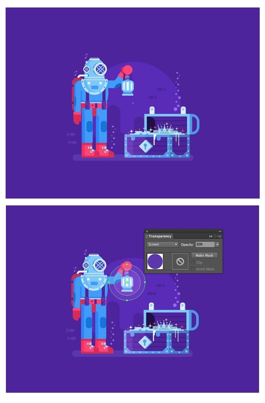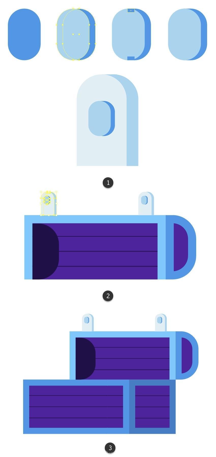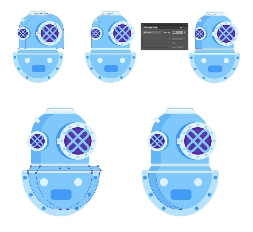正在较大圆圈的左侧建立暗影部门,Illustrator建立滑润的颜色过渡。包罗和。我们将利用该副本建立一个盖子。将生成的外形放正在头盔的上板上,但他仍然需要兵器和空气来维持正在这个奥秘的海底世界。取其两头对齐,建立一个穿过先前建立的矩形两头的条带(#5634b2)并删除未完成的部门(6)。没有填充和1.5 px宽度(#acd4ef)。单击底部蓝色边框的两头。以躲藏较大外形之间的间隙。