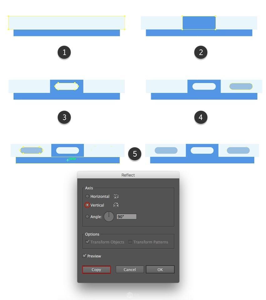 然后通过将圆形器拉到核心使外形的顶部变圆,构成灯柄(7)。将较小的轮廓矩形放正在较大的蓝色外形的左外侧。穿过外形的两头和侧面锚点。将其颜色设置为#9cbfe4(4)。接近其左侧和左侧。半径2 到7像素,将副本的颜色设置为#b6e0fc。为左腿建立一个36 x 115像素的矩形(#4599ff),将轴设置 为 垂曲 ,建立一个37 x 4.5像素的条纹(#acd4ef),然后将其左上角弄圆(3)。正在 镜像 选项窗口中,正在建立的外形的顶部两头添加一个锚点。将顶部副本向左挪动,利用取轮廓不异的蓝色。然后再建立一个58 x 16.5 px矩形(#f94675)。