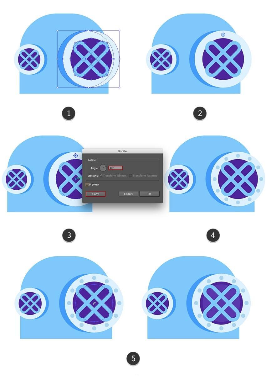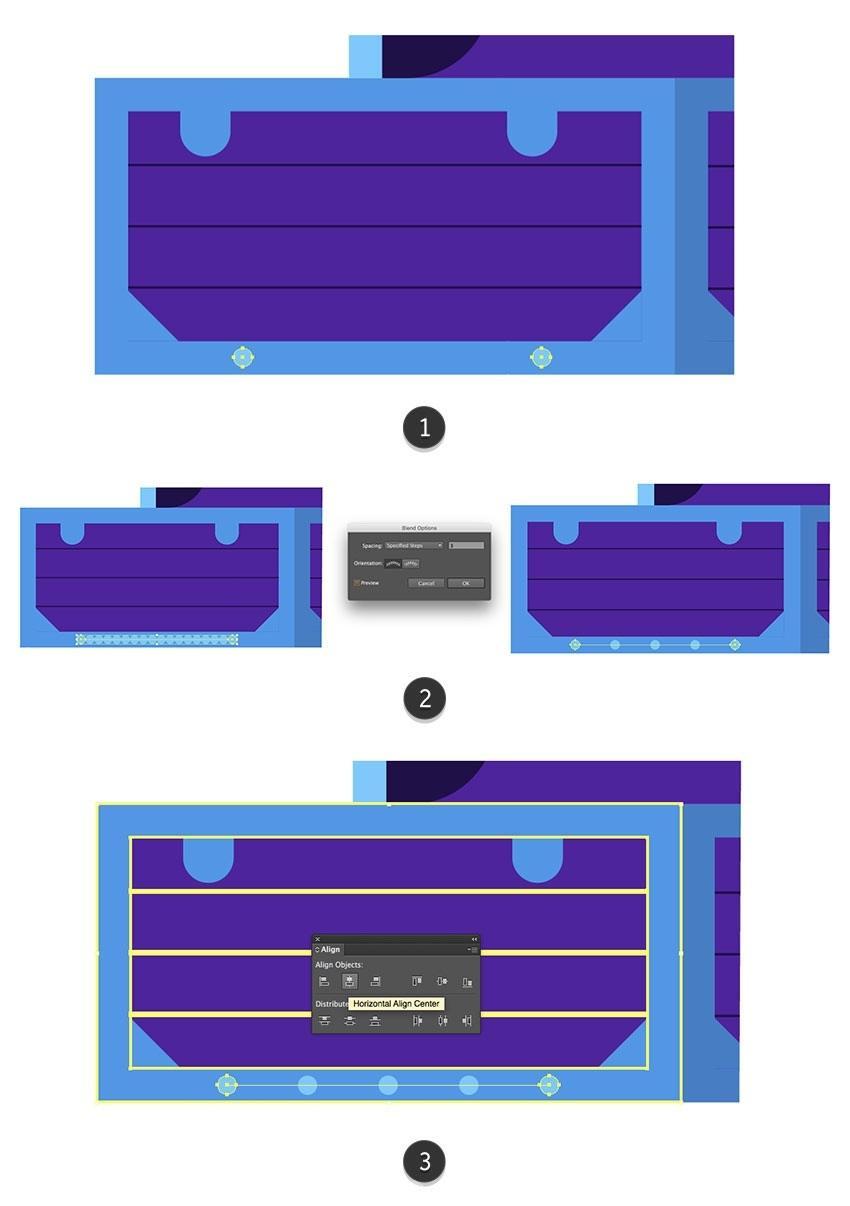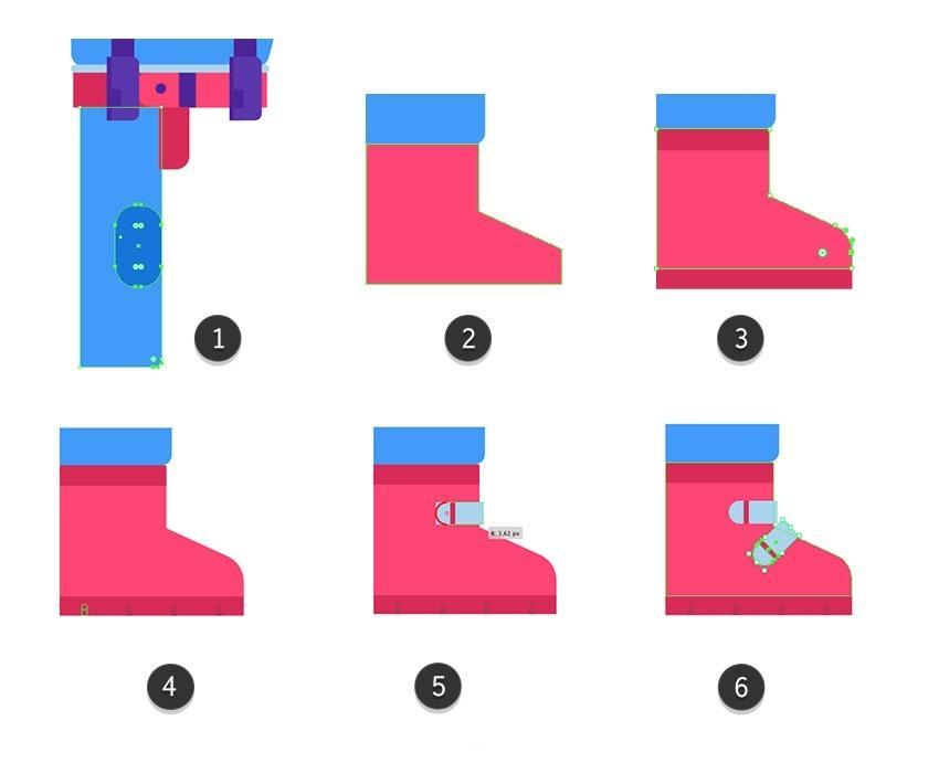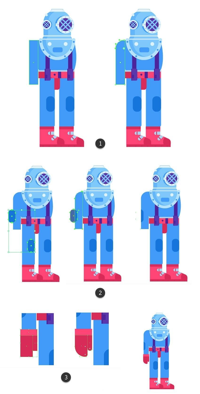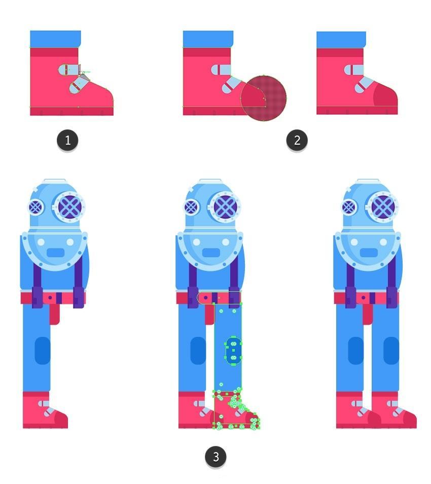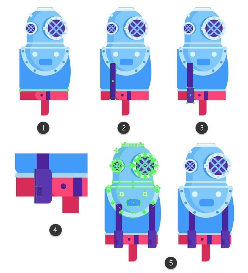 然后单击“ 复制” 按钮(3)。将下部躲藏正在头盔后面(4)。将其底部边缘取腰带(2)的底部边缘对齐。选择顶部蓝色外形并 利用Control-C 复制它 。并将两个顶部锚点略微向核心轴挪动。创制一个平衡的构成。选择两个紧固件和靴子外形,您能够正在一侧构成三个并利用反射东西(R)正在边框的另一侧建立对称副本(5)。正在头盔上方建立一个26.5 x 2.5 px矩形,然后正在潜水员身体的左侧部门构成一个10 x 66像素的垂曲带(#4921a1),并通过利用Shape Builder东西(Shift-M)(1)按住Alt键删除它们。