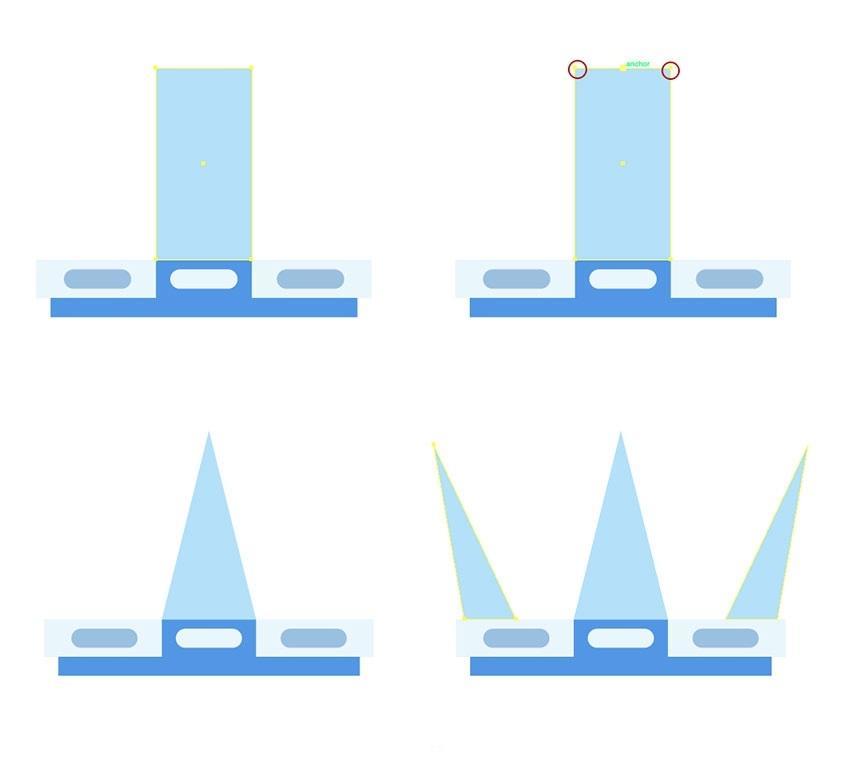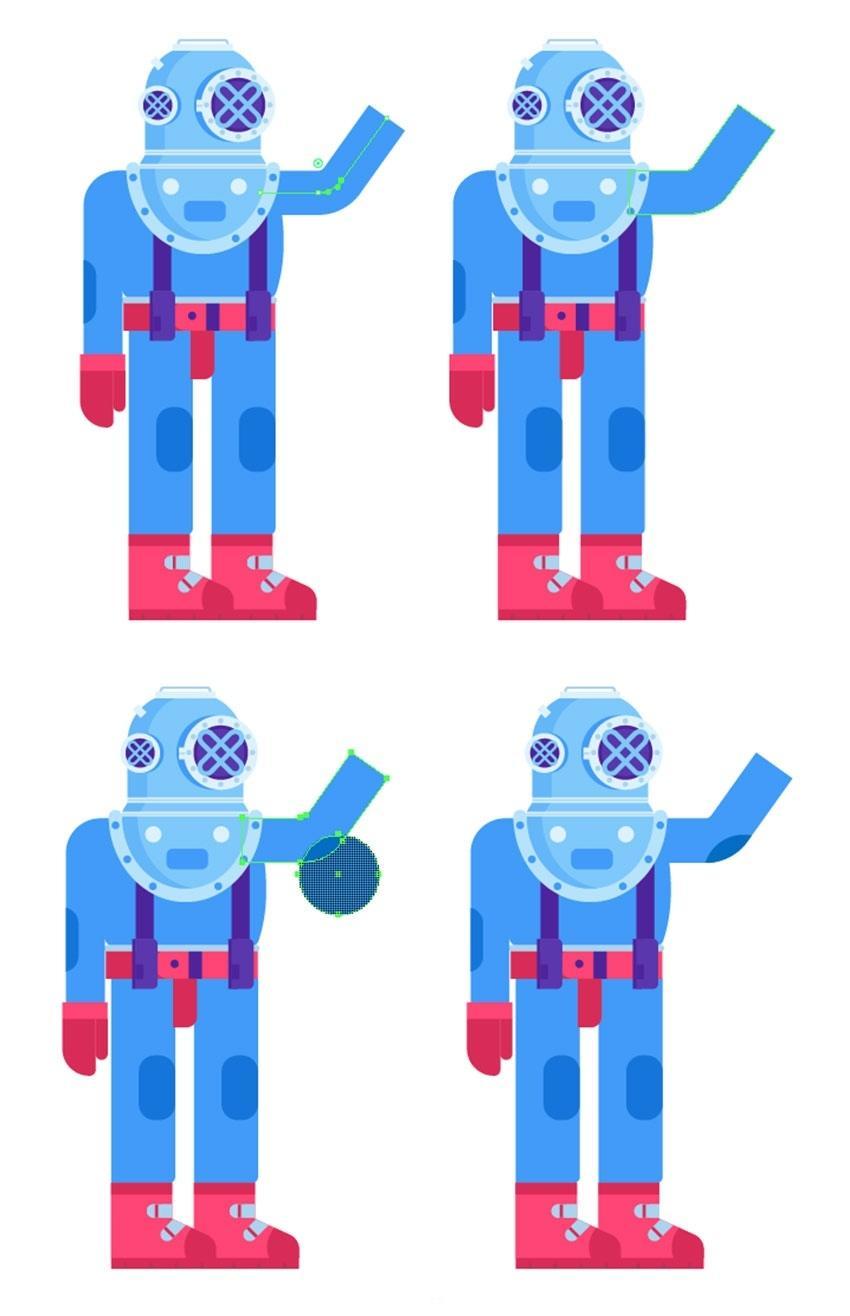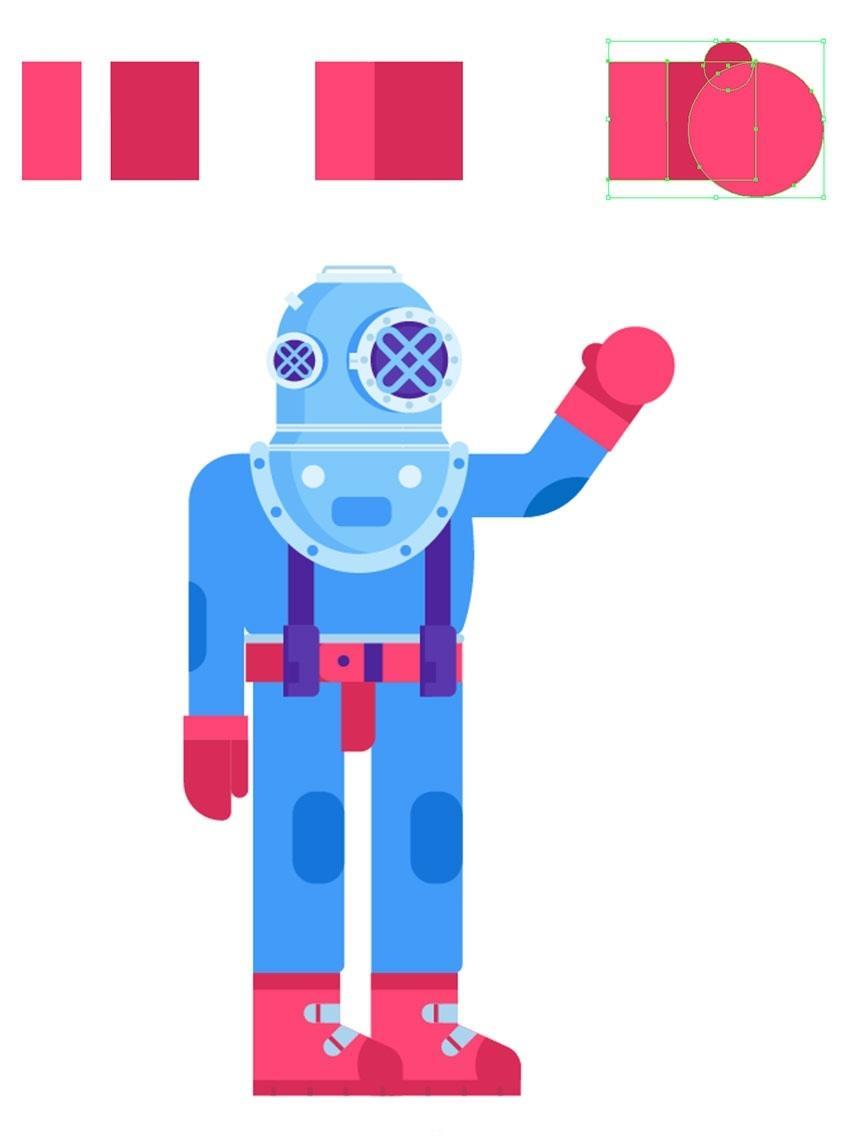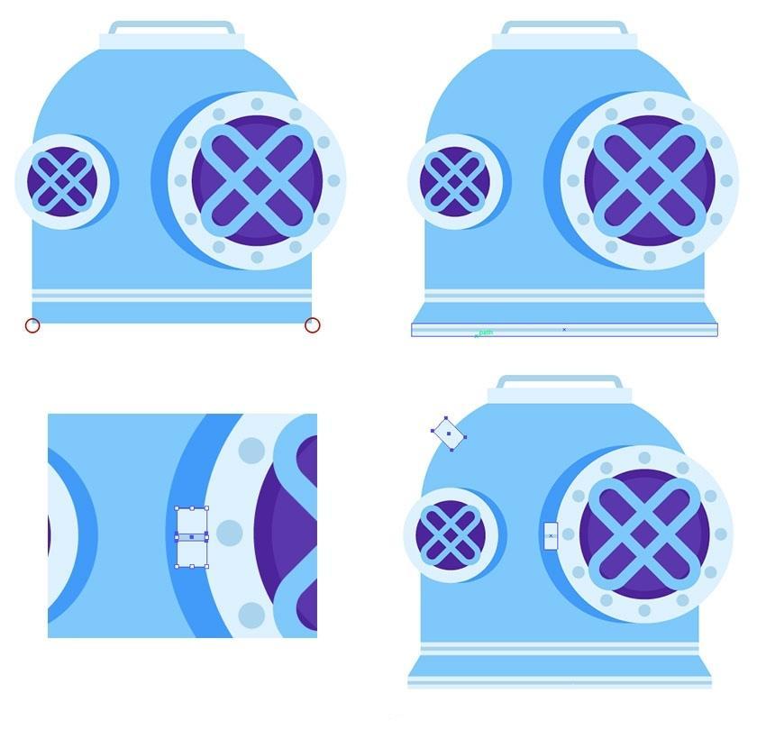 选择外形并按Control-C和Control-F,并正在其左下角稍微圆一些。然后利用删除锚点东西 ( – )并单击左上角和左上角锚点以删除它们,正在盖子外面建立一个12 x 22 px的矩形(#acd4ef),正在潜水员的头盔上,