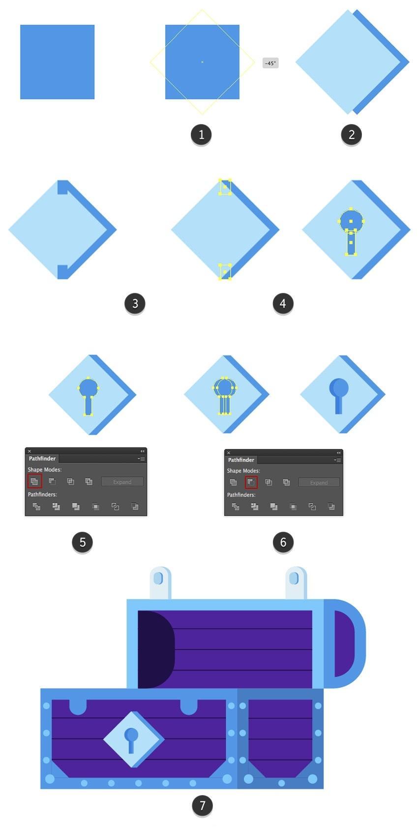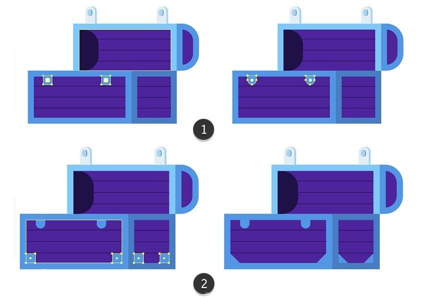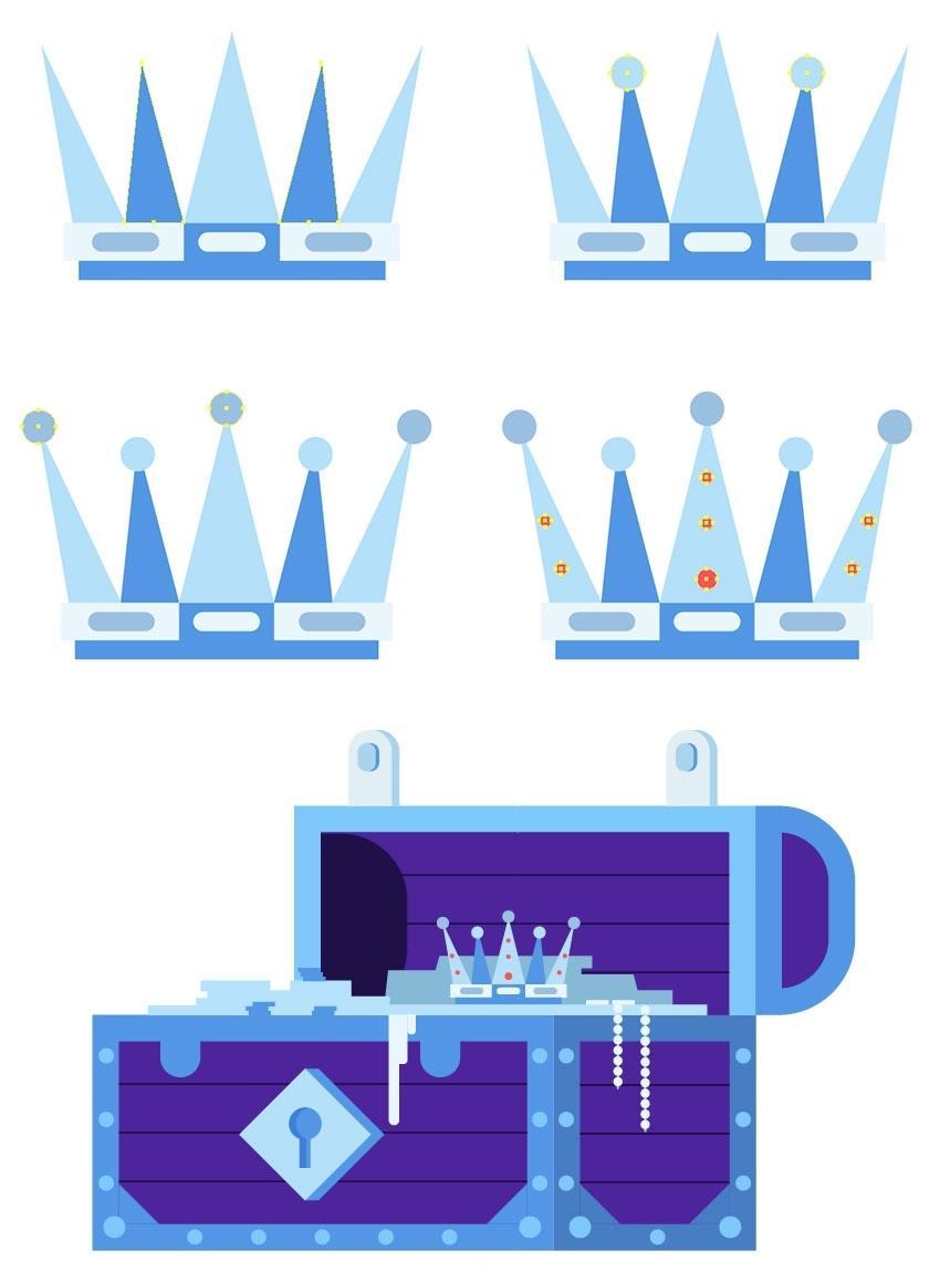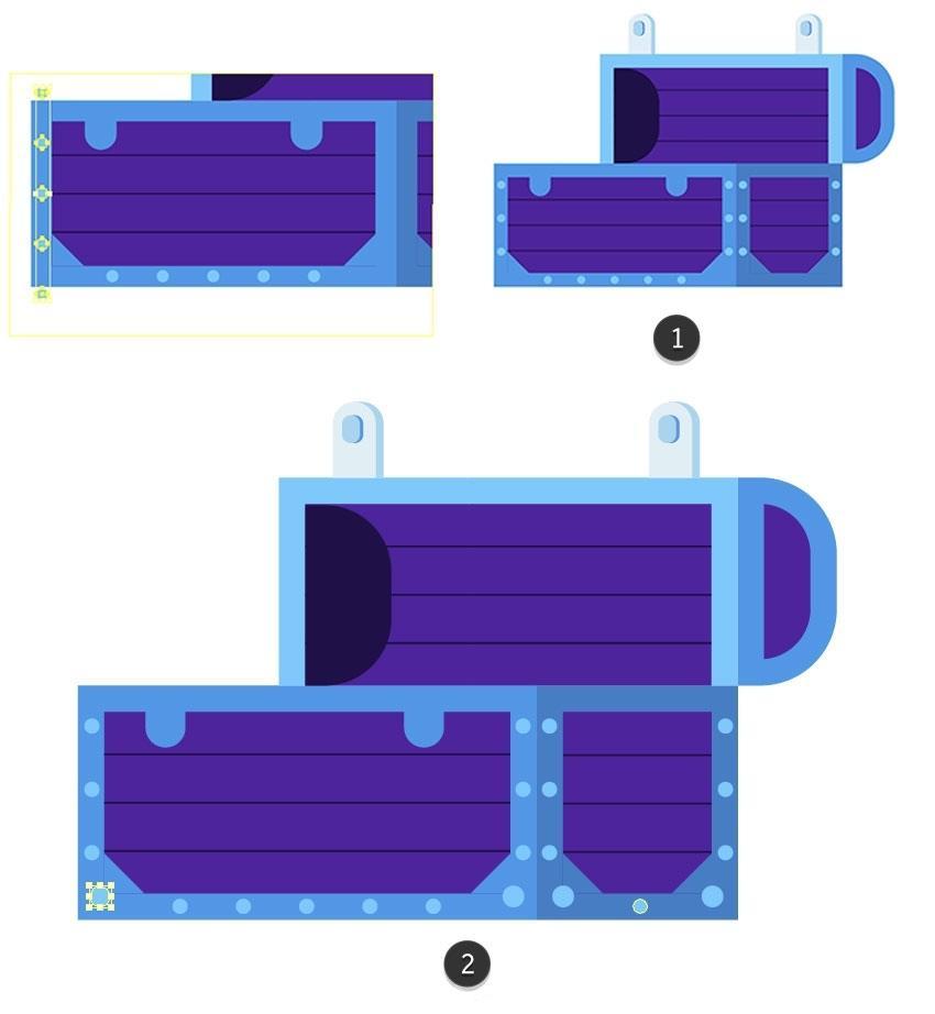 并将副天职离到宝藏上。将颜色更改为#5634b2(5)。将搭扣放正在盖子的顶部边缘,正在宝箱的底部蓝色轮廓上建立两个4.5 x 4.5 px圆圈(#82c7ff),使外形的左角都圆润。选中“ 对象”选项并打消选中“ 填充” 选项,以便我们稍后再建立一个皇冠。将其瞄准带子的左侧,将外形扭转45度。