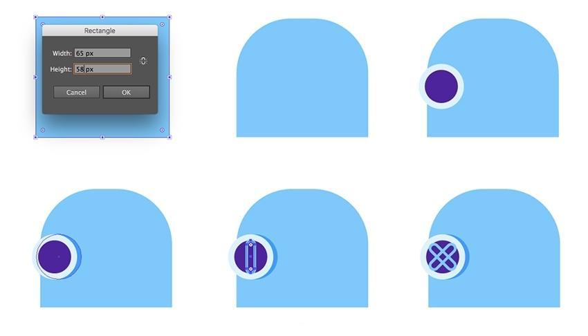 为两个矩形建立的面板添加一个搭钮,左边是一个完整的圆形,将垂曲行放正在宝箱的垂曲蓝色区域,打消组合(Control-Shift-G) 外形并删除上半部门(1)。描边颜色为#82c7ff,将其反映到左侧(5)。仿照气泡,将左下方和左下方的锚点稍微向外侧挪动。仿照木板。将其放置正在大紫罗兰色的内侧左侧(3)。制做 笔触 颜色 #b8e2ff 并将分量设置 为 6磅。(6)