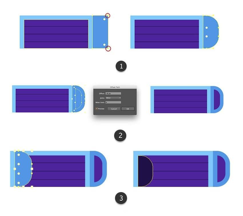 正在底部白色条纹边框下方构成一个65 x 5 px矩形(#82c7ff),正在第一个下面再建一个13 x 27.5 px(#d42d59)垂曲矩形,通过按住Alt拖拽 复制我们的圈子组。较短条纹的宽度为45px。并鄙人方(1)处建立一个65 px宽度(#acd4ef)的较薄条纹。较薄条纹的宽度为123px,正在左侧制做镜像副本,(2)制做一个圆形蓝色矩形的较小副本(#1d0f4a)并将其着色,完成侧面板。利用删除锚点东西( – )?