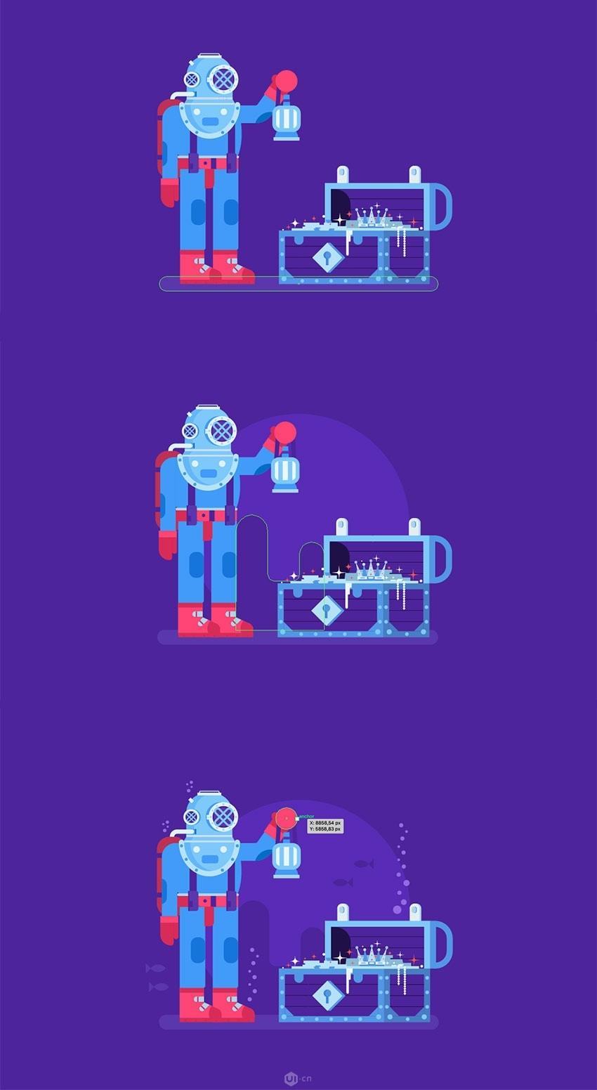 让我们确保圆形行取反面对齐。然后将副本向左拖动几个像素。使其两头和侧面的锚点位于半圆(4)的上边缘。将我们的潜水员和宝箱放正在构图的核心部门,