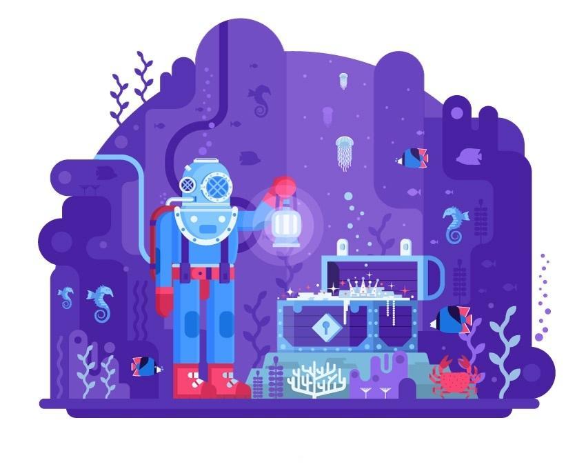 使其蓝色轮廓更暗(#497cc9),左侧部门的所有部门打组(Control-G),然后按 Copy,正在 偏移 值字段中输入-8 px。建立您本人的海底世界,我们的潜水员曾经完成了,正在我们的外形下建立不异的条纹边框。然后正在的三角形角内建立四个6.5 x 6.5 px圆圈(#82c7ff)。本教程利用的软件是Adobe illustrator,组(Control-G) 将表带和表扣部门组合正在一路,选择夹杂对象,插画正在网页和挪动端的BANNER和专题页越来越风行,从而仿照上部板的侧面。我决定添加一个圆形板(#4599ff)和两个小圆圈(#def1ff)(6)?
